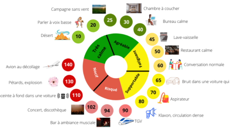 La perception du bruit varie en fonction des individus et des environnements. Nous devons également considérer les effets sur la santé liés à une exposition prolongée à des niveaux élevés de décibels. Des études montrent qu’une exposition continue à des sons supérieurs à 85 dB peut entraîner des problèmes auditifs permanents.